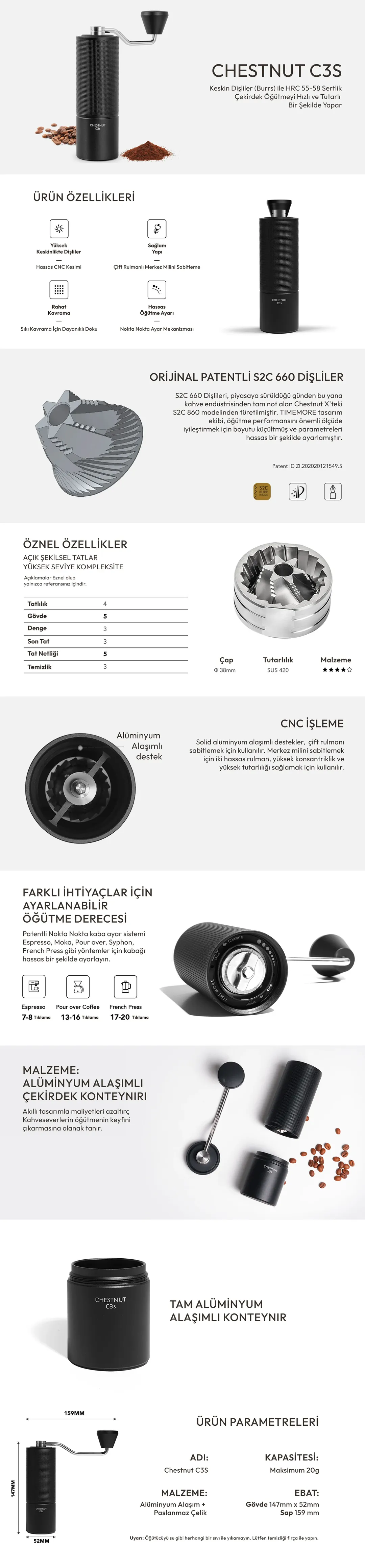 Yeni Timemore Chesnut C3S El Tipi Kahve Değirmeni Keskin S2C Dişlileri İle daha Hızlı ve Daha Tutarlı